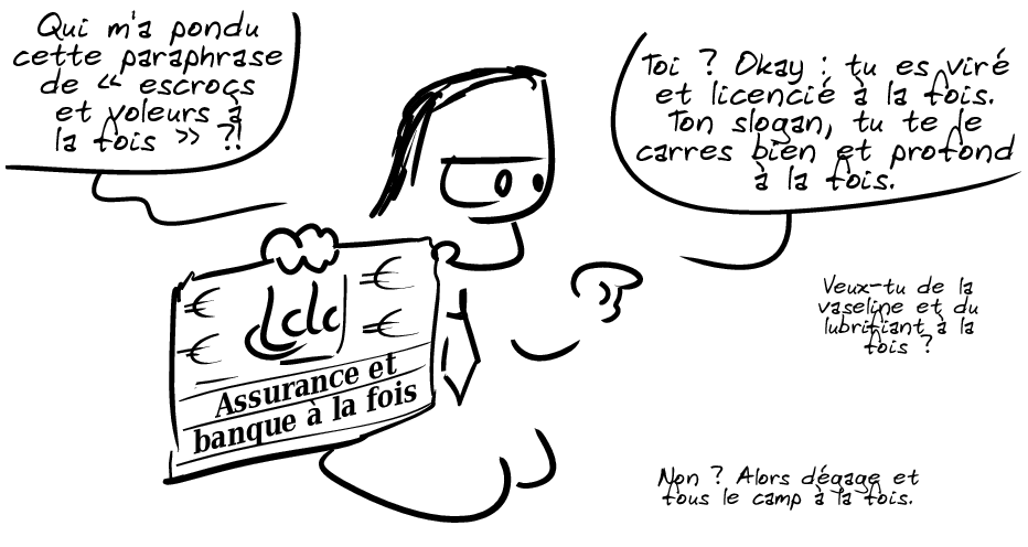 Voici le premier épisode d’une série sur les banques. C’est un tel vivier à bastardises qu’il est impossible de dire combien d’épisodes nous leur consacrerons, ni de citer toutes les personnes qui nous en ont parlé… Mais merci à vous pour l’inspiration..