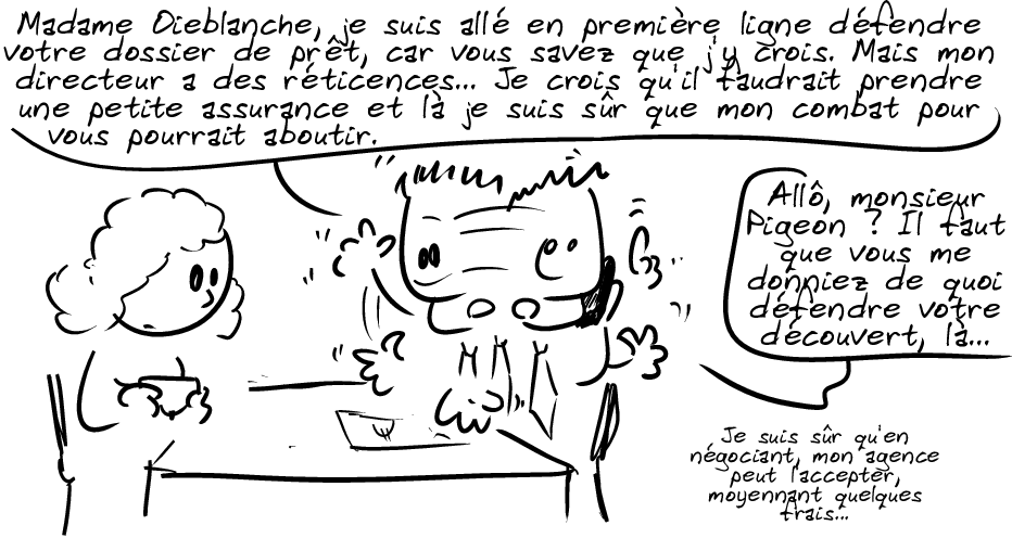 Oui : les assurances, c’est le seul pari que vous y gagnez si et quand ça va très mal pour vous… Mais les esprits faibles et influençables (c’est à dire la majeure partie des gens) vont y souscrire juste pour se dire qu’ils n’en ont pas besoin. Pour perpétuer en eux ce narratif que les tuiles n’arrivent qu’aux autres ; que les angoisses peuvent se circonscrire en une option à cocher en achetant son billet d’avion ou son téléphone portable. Seulement, pour parvenir à dompter la peur afin qu’elle se réduise à quelques caractères minuscules et un surcoût de quelques euros par mois ; il faut un marabout puissant, un rebouteux à la réputation établie, un griot de confiance… Bref : l’inverse de l’image donnée actuellement par nos banques, et a fortiori nos assurances.