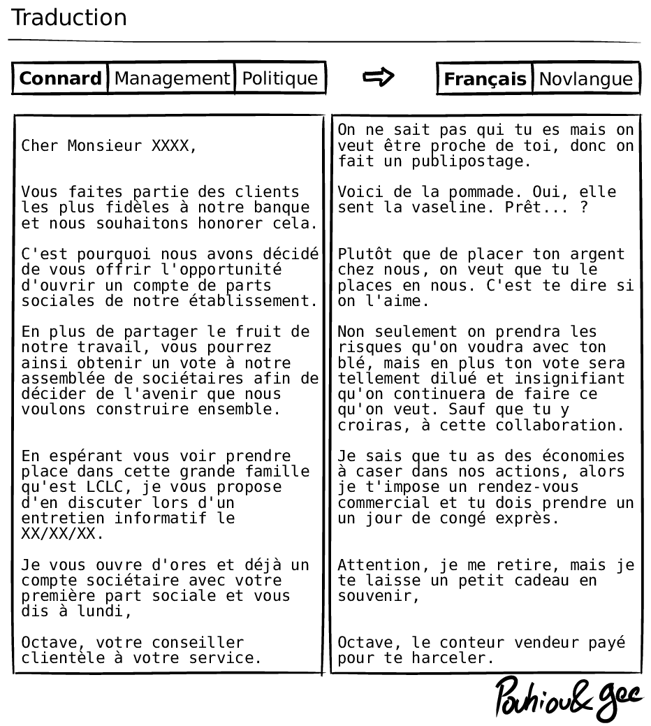 J’ai moi-même atteint ce but en rédigeant la campagne email à l’intention des « meilleurs clients de la LCLC ». Afin que vous en saisissiez toutes les subtilités, je vous transcris ce document via notre module de traduction de connardises, un outil actuellement en version bêta que nous espérons bientôt pouvoir proposer en complément de ces leçons.