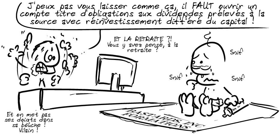 Éduquer le client est un travail de chaque instant, et la pédagogie se cache dans les détails. Plus son conseiller lui sera anxiogène, plus le fait de travailler à sa place sera pris comme une libération. Une libération qu’on peut lui faire payer au prix fort. Bien entendu, son option « banque en ligne » lui permettra de ne gérer que les basses besognes, afin qu’il n’ait pas de réelle emprise sur la gestions de ses comptes… On ne veut pas qu’il commence à se croire responsable de son argent ni qu’il ait un faux sentiment de maîtrise. Les rendez-vous en tête à tête seront donc toujours essentiels pour les banques, ne serait-ce que pour remettre le client à sa juste place : celle du docile bovin lactifère.