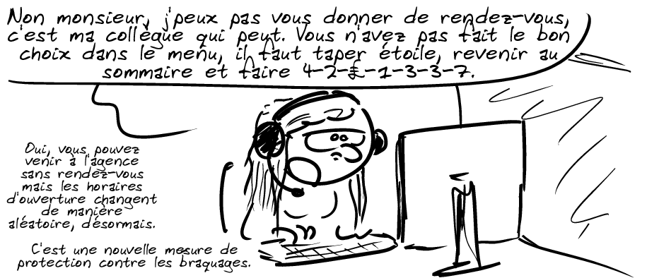 La liberté n’a pas de prix, mais que cela ne vous empêche pas d’essayer de la facturer. Tout comme l’option « compte en ligne » (qui est débitée au client soit directement, soit par la mise en place d’un forfait de services), l’appel pour prendre rendez-vous avec son conseiller doit être surtaxé. Ainsi, votre conseiller pourra le convoquer à la banque selon son bon vouloir. Mais cela ne peut être à double sens : si le client veut venir de lui-même, il faut lui compliquer la tache au maximum et ainsi lui faire comprendre la faible importance de ses désirs et velléités.