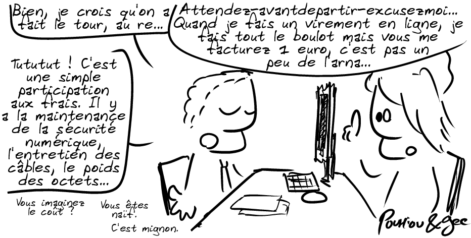 L’intérêt de donner aux banques un visage humain a été brillamment exposé dans le cours précédent. L’avantage de rendre ce visage aussi antipathique que celui de votre oncle raciste et homophobe, c’est que le client sera prêt à tous les sacrifices pour ne pas aller voir de lui-même son banquier. Quitte à payer pour pouvoir faire le travail de son conseiller financier à sa place, réduisant d’autant la masse salariale qui pèse sur les établissements bancaires.