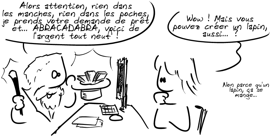 Nous produisons constamment des valeurs, donc il faut régulièrement créer du nouvel argent. Le système actuel est donc simple : c’est celui de l’argent-dette. Lorsque l’on va faire un prêt, le banquier crée l’argent sur notre compte, et nous lui signons en échange une reconnaissance de dettes. Au fur et à mesure que notre salaire rembourse ce prêt, le banquier remplace l’argent magique qu’il a créé par l’argent de notre travail, donc par les valeurs que nous avons générées… Et ainsi la masse monétaire a augmentée du capital que nous remboursons. Voilà une horlogerie parfaitement huilée, qui fonctionne sans soucis.