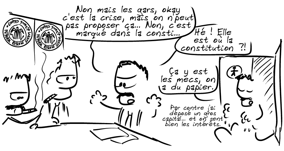Dès lors, en nous déconnectant de la valeur que nous mettons dans les ressources, de nombreux connards historiques ont pu s’en donner à cœur joie. Mais, à l’instar de Rome, les Banques Centrales ne se sont pas créées en un jour. Longtemps les représentants du peuple ont tenu à indexer la valeur de l’argent sur des choses concrètes, telles que les lingots d’or, et à conserver les clefs de la planche à billets, le fameux « pouvoir de création monétaire ». Ainsi, les pères fondateurs des États-Unis tenaient tellement ces principes comme des libertés fondamentales qu’ils les avaient gravés dans la constitution même. Il a fallu les crises financières de 1917 et de 1929 pour les y déloger.