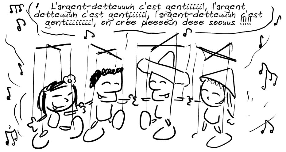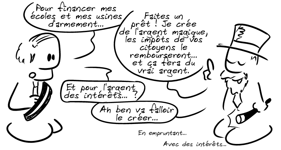 Modifier les mentalités de l’esclave du travailleur moyen pour enfin parvenir à ce somptueux monopole a nécessité les efforts successifs de nombreux connards au fil du temps. Ceux qui nous ont convaincu que la valeur est le fruit du travail, et non celui de chacune de nos actions. Ceux qui nous ont fait croire que créer de l’argent est plus important que de créer de la valeur. Ceux qui ont conçu les mécanismes pour créer, canaliser et endiguer les flux monétaires… Et ceux qui ont décrédibilisé les hommes politiques jusqu’à ce qu’on leur retire la responsabilité de l’argent. Car aujourd’hui, pour créer de l’argent, même les états doivent emprunter aux banques.